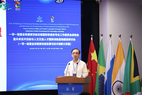 近日,一帶一路暨金磚國家技能發(fā)展國際聯(lián)盟各專業(yè)工作委員會啟動會暨未來技術(shù)技能與人文交流人才國際訓練基地建設(shè)研討會在廈門成功舉辦。教育部中外人文交流中心副主任夏娟,一帶一路暨金磚國家技能發(fā)展國際聯(lián)盟理事長、廈門市金磚未來技能發(fā)展與技術(shù)創(chuàng)新研究院院長劉振英出席會議并致辭。廈門市教育局副局長洪軍、廈門市人社局副局長彭新良、教育部中外人文交流中心機制工作二處處長陳滔偉、廈門市教育局高教職教處處長陳哲新、中國交通教育研究會副會長楊澤宇、教育部中外人文交流中心機制工作二處張馨心、廈門市金磚辦代表沈麗瓊、廈門火炬管委會代表蔡坤海、廈門市集美區(qū)人民政府代表于淑雅出席會議。來自全國82所院校、18家企業(yè)和社會團體的200多名領(lǐng)導和專家現(xiàn)場參會。
