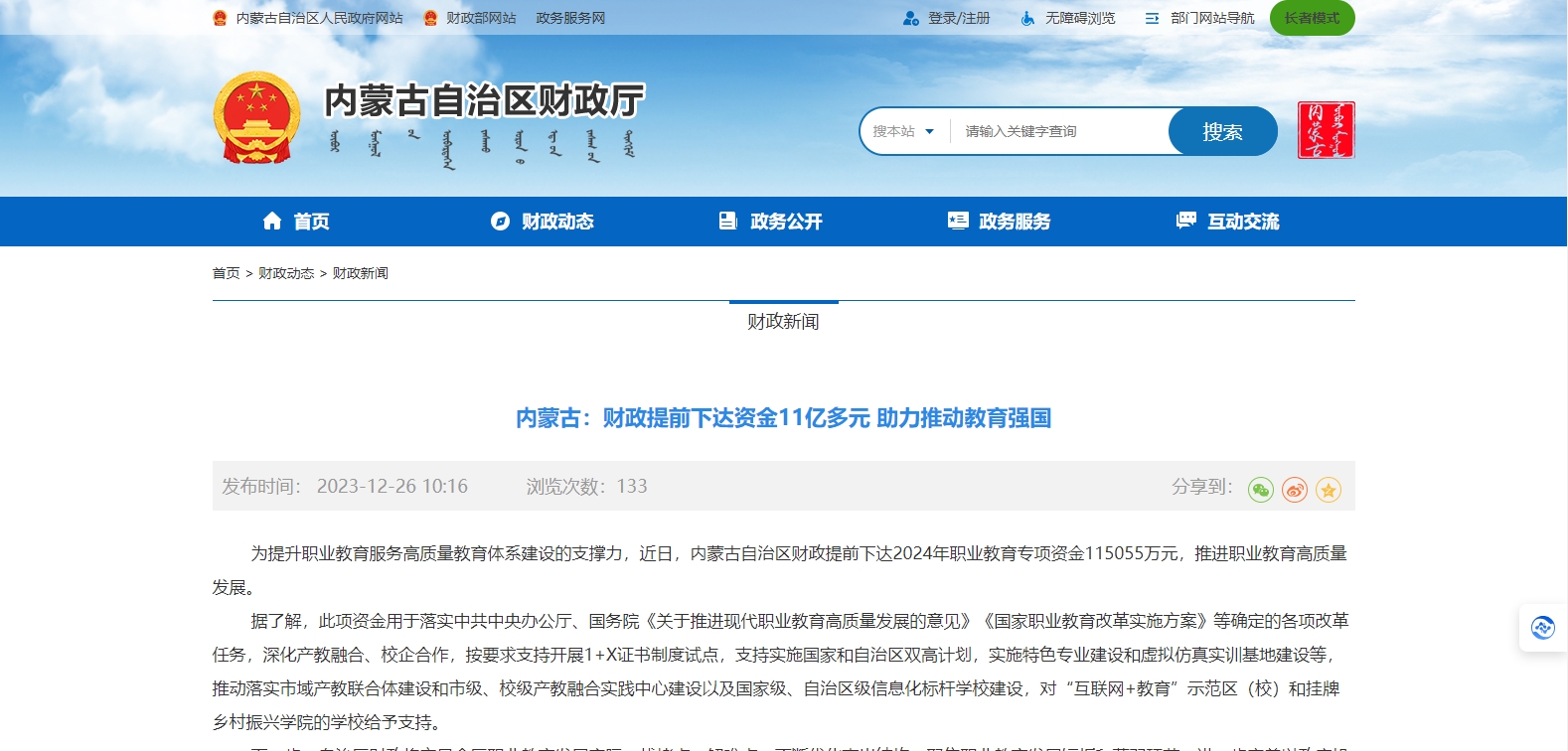 為提升職業(yè)教育服務高質(zhì)量教育體系建設的支撐力,近日,內(nèi)蒙古自治區(qū)財政提前下達2024年職業(yè)教育專項資金115055萬元,推進職業(yè)教育高質(zhì)量發(fā)展。